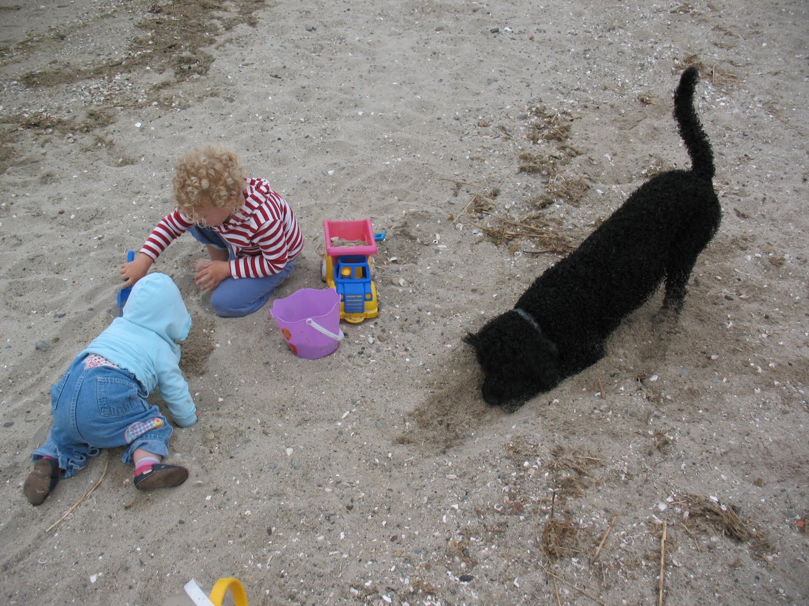 We have been staying with our friend Baxter. His house is walking distance from the beach, so we have been having many beach walks together. He is a great friend to Penelope, she loves bossing him around, playing hide and seek, and feeding him. And she loves the fact that he has curly hair just like she does.