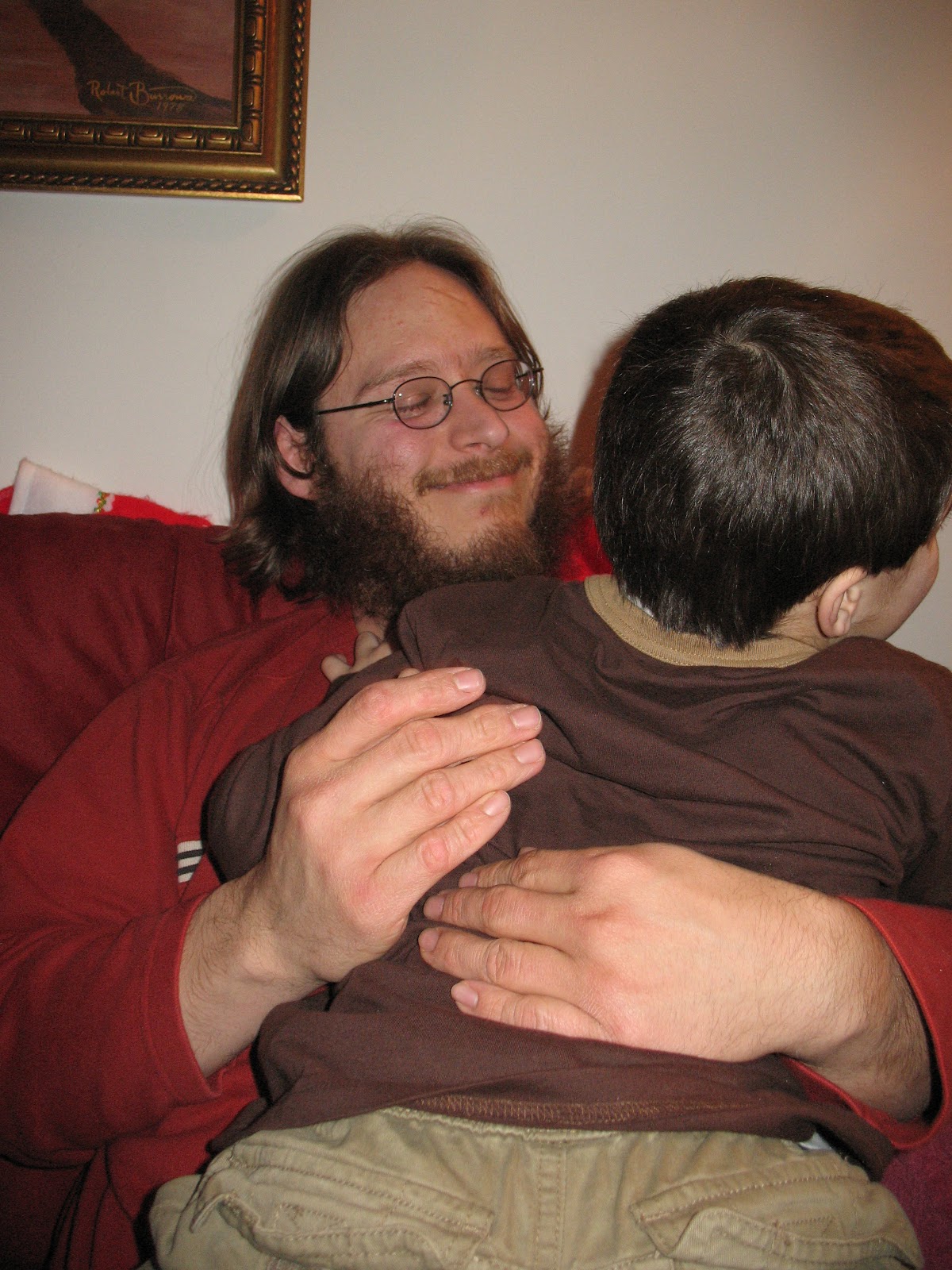 | Pen waiting with excitement for Steve to open her gift, and Steve's wearing the hat I knit him. |